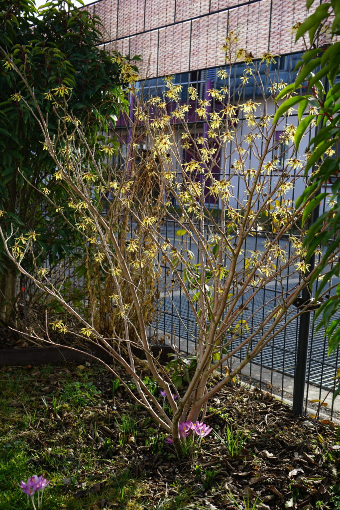 Les hamamelis ont besoin de lumière au printemps pour fleurir. Vous pouvez donc les planter soit au soleil soit à la  mis-ombre d’arbres caduques. Encore une fois cela dépend aussi d’où vous habitez. Je vie en Suisse et j’ai fait le choix d’en placer un plein soleil (car juste devant mes fenêtres). Je veille juste à l’arroser un peu en été. L’autre qui est à mis-ombre se débrouille seul.