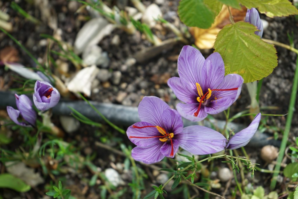 Les fleurs de safran ressemblent à celles des crocus (même famille). Attention les crocus et colchiques sont toxiques. Mais il n’y pas vraiment de risque de se tromper : seuls les safrans ont ces beaux stigmates rouges.